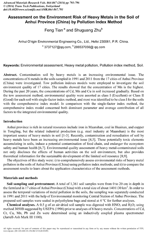 安徽長之源環(huán)境工程有限公司秉承以專業(yè)筑根本的指導(dǎo)思想,在積極拓展環(huán)境監(jiān)理及相關(guān)環(huán)保咨詢業(yè)務(wù),做好橫向項(xiàng)目的同時(shí),絲毫不放松對(duì)學(xué)術(shù)與科研的要求。近日,我公司又一篇EI收錄英文論文Assessment on the Environment Risk of Heavy Metals in the Soil of Anhui Province (China) by Pollution Index Method被發(fā)表刊出。